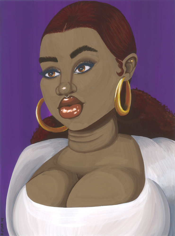 Presentamos "99j", una fascinante obra maestra de nuestra prestigiosa serie "Coronas Coloridas", donde la elegancia de la mujer negra se entrelaza con la riqueza de sus vibrantes tonos. Esta cautivadora pintura presenta a una mujer negra con cabello color borgoña, cuya cautivadora presencia se destaca sobre un lujoso fondo violeta, evocando pasión, sofisticación y empoderamiento.