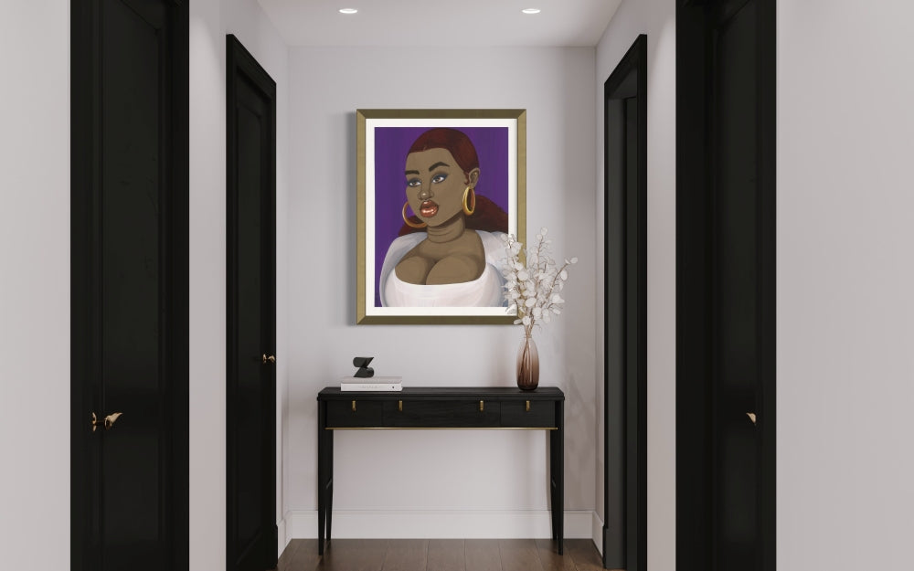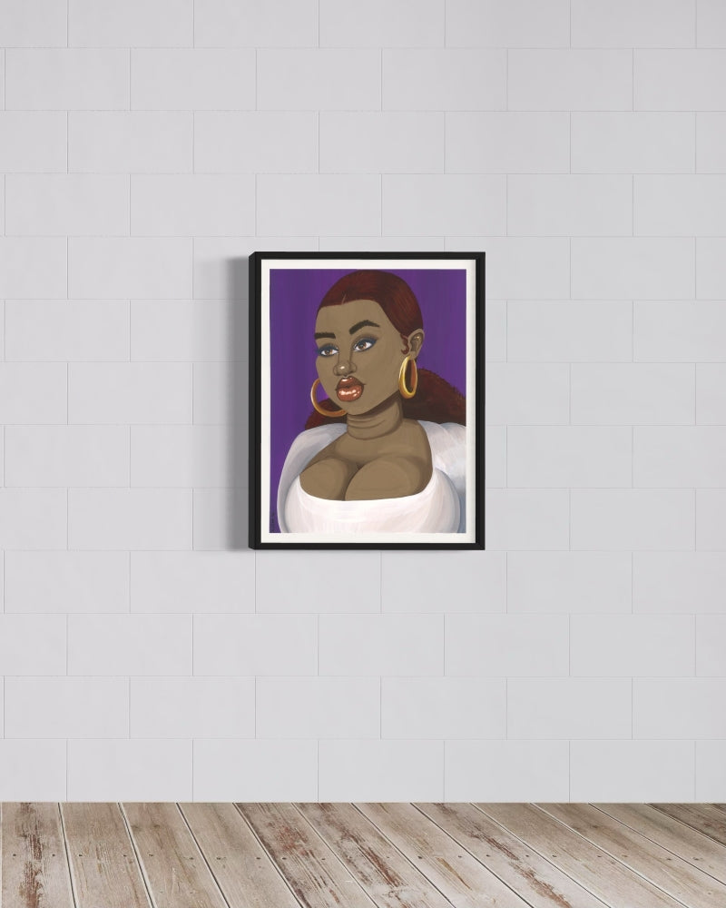 Sumérgete en un mundo de opulencia y creatividad con el lujoso fondo violeta del "99j", un color que simboliza la realeza, la pasión y la expresión artística. Admira la corona simbólica que adorna la cabeza de la protagonista, representando su poder, belleza y majestuosidad inherentes como mujer negra, afirmando su identidad con orgullo y elegancia.