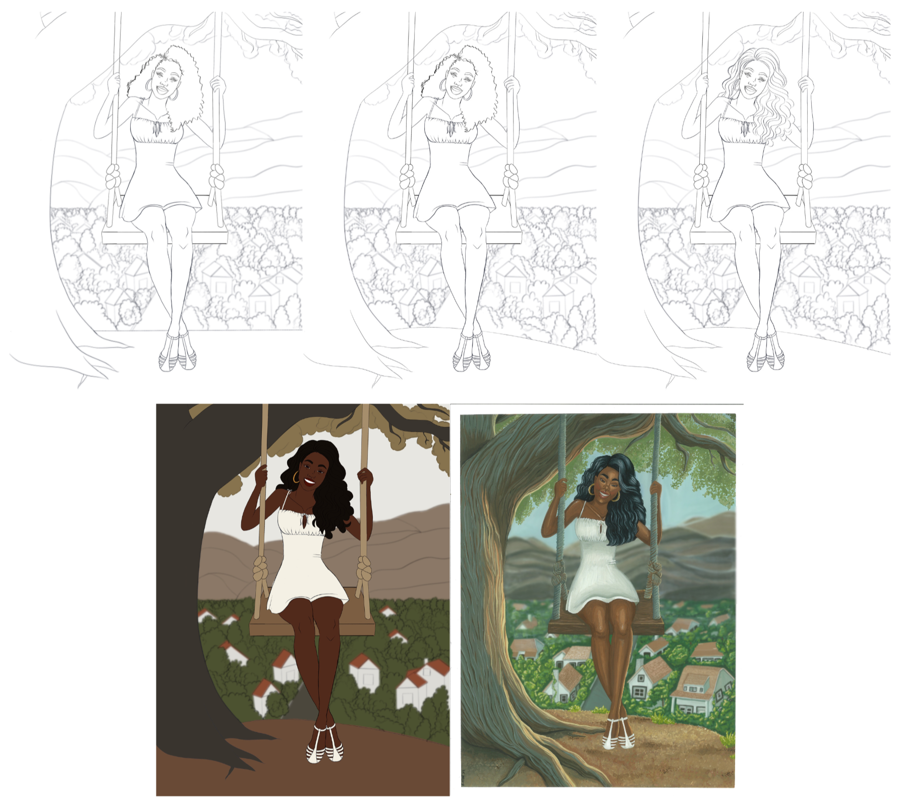 My name is _________, and I'm reaching out to request a custom painting of a young woman on a tree swing, based on the attached reference image. I'd like the painting to have a 90s, suburbia aesthetic with a background of a neighborhood with lots of trees and maybe a distant mountain range. I would like a 9x12" finished piece, and you can have creative freedom on the media. Can you give me a quote on price, as well as an estimate of the turnaround time?