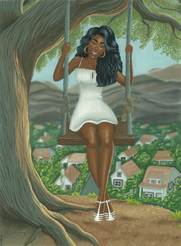 Centerpiece Figure: At the heart of the painting, a black woman swings gently from an old, sturdy tree, her figure a symbol of grace and quiet strength. Her presence adds a personal and introspective element to the landscape, inviting viewers to imagine themselves in her place, embracing the calm of the natural world.