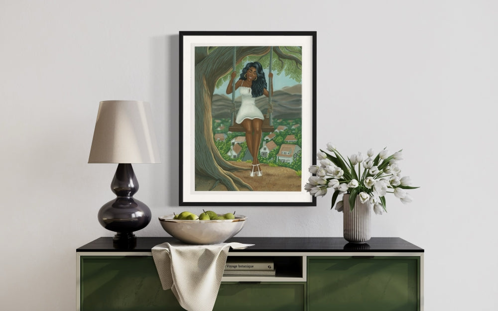 Introducing "Sunny Valley," a commissioned painting that captures the essence of tranquility and beauty through the depiction of a black woman on a tree swing, overlooking a lush, tree-filled valley neighborhood with distant mountains. This evocative artwork not only highlights the beauty of nature but also celebrates the serenity and joy of a moment stolen from time.